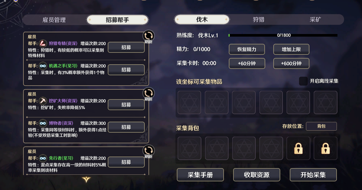 - 可为雇员招募帮手,帮手能提供增益效果以提升采集效率。