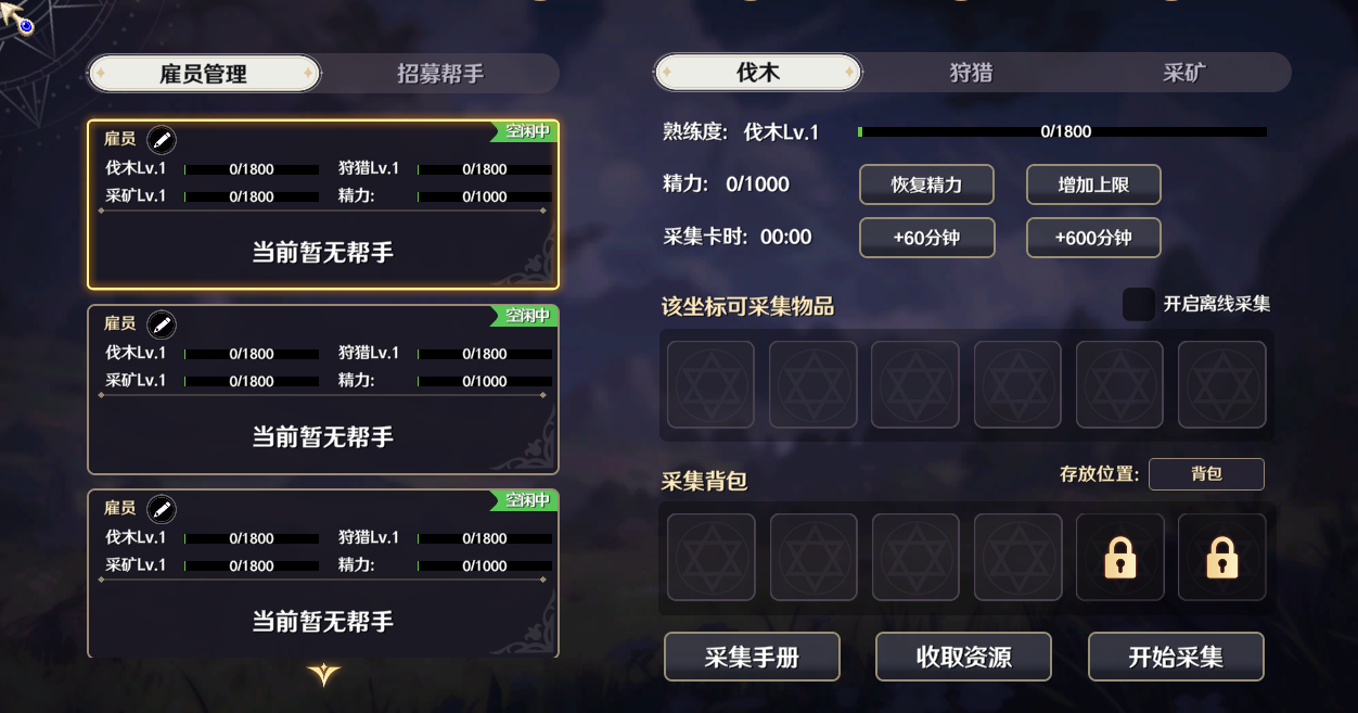 - 可为雇员招募帮手,帮手能提供增益效果以提升采集效率。